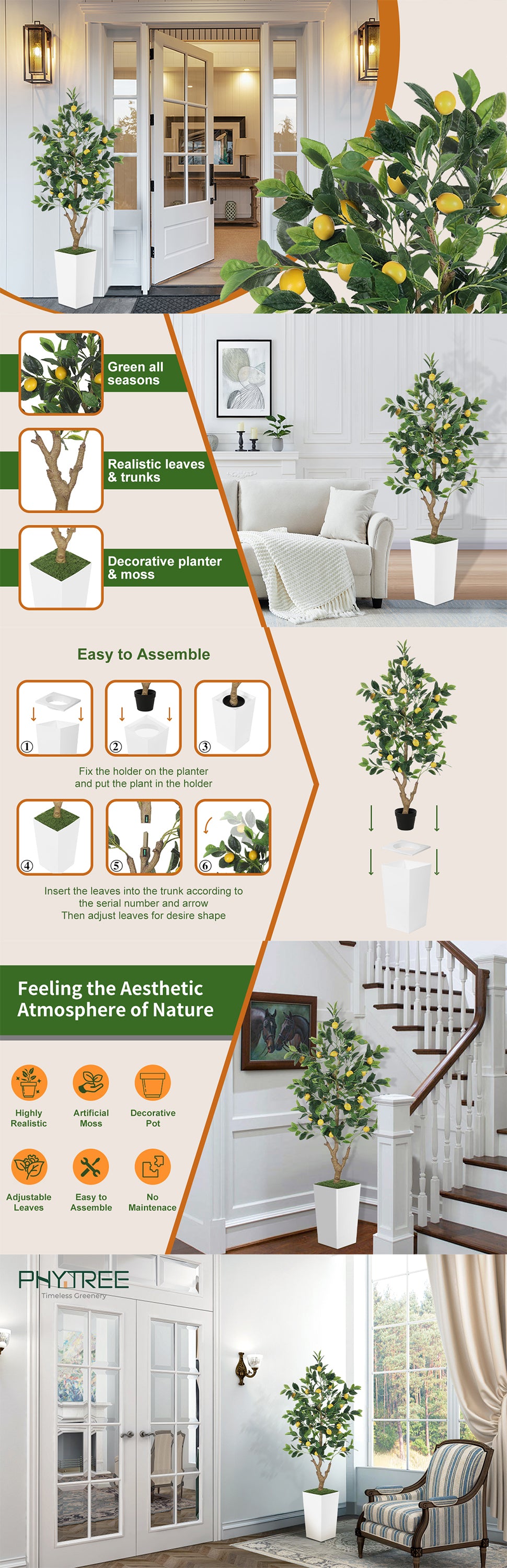 5ft artificial lemon tree includes a durable plastic planter and faux moss. Base can hold sandbags for added stability. A hassle-free way to bring tropical charm to any space.